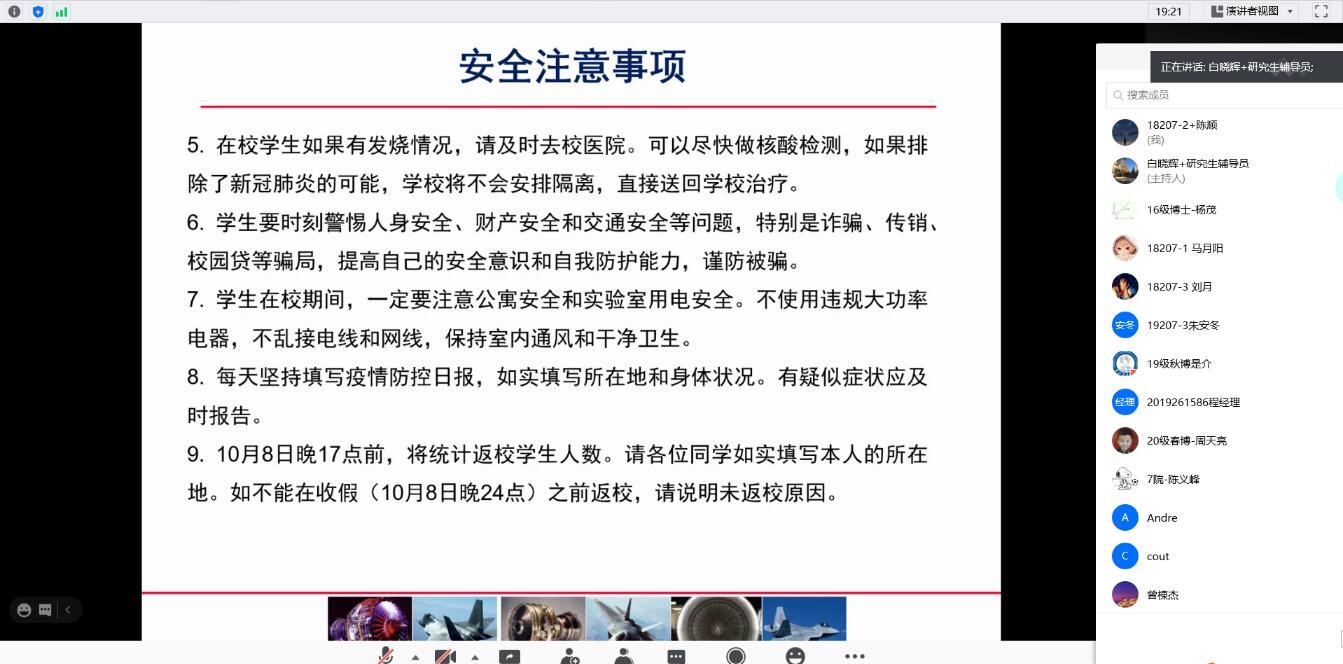 最后,白晓辉老师祝愿同学们度过一个安全、有趣、充实的国庆、中秋假期。此次安全教育会议,对硕博研究生提高安全意识、做好疫情防控起到一定的帮助,为大家安全度过双节打下基础。