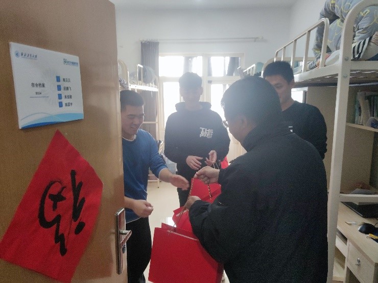 慰问过程中,王占学代表学院向同学们致以新年的问候,并亲切的与同学们拉家常,从“家乡在哪”、“家里几口人”,到“学习生活有没有困难”、“大学学习有什么计划”、“未来想从事什么职业”,王院长一边听取同学们的介绍,一边结合自己的工作、学习经历,给同学们提出建议。他鼓励同学们要珍惜大学的美好时光,利用好学校学院提供的各项资源和条件,抓住机会迎接挑战,除了保质保量完成自己的学习任务外,还要坚持锻炼身体,为自己未来的学习和生活打造强健的体魄。此外王院长还针对即将到来的期末考试,鼓励同学们抓紧本学期的最后15天,总结一学期的收获,按计划开展复习备考工作,争取在春节来临之际给家人拿出一份满意的成绩单。