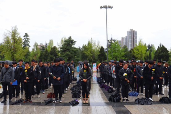 在西安烈士陵园,庄严的国歌声响起。家国又清明,鲜花献英烈。一百余位动能青年手持菊花,站在烈士纪念碑前进行缅怀仪式,集体向烈士默哀一分钟,随后全体人员有序向革命烈士敬献花束。