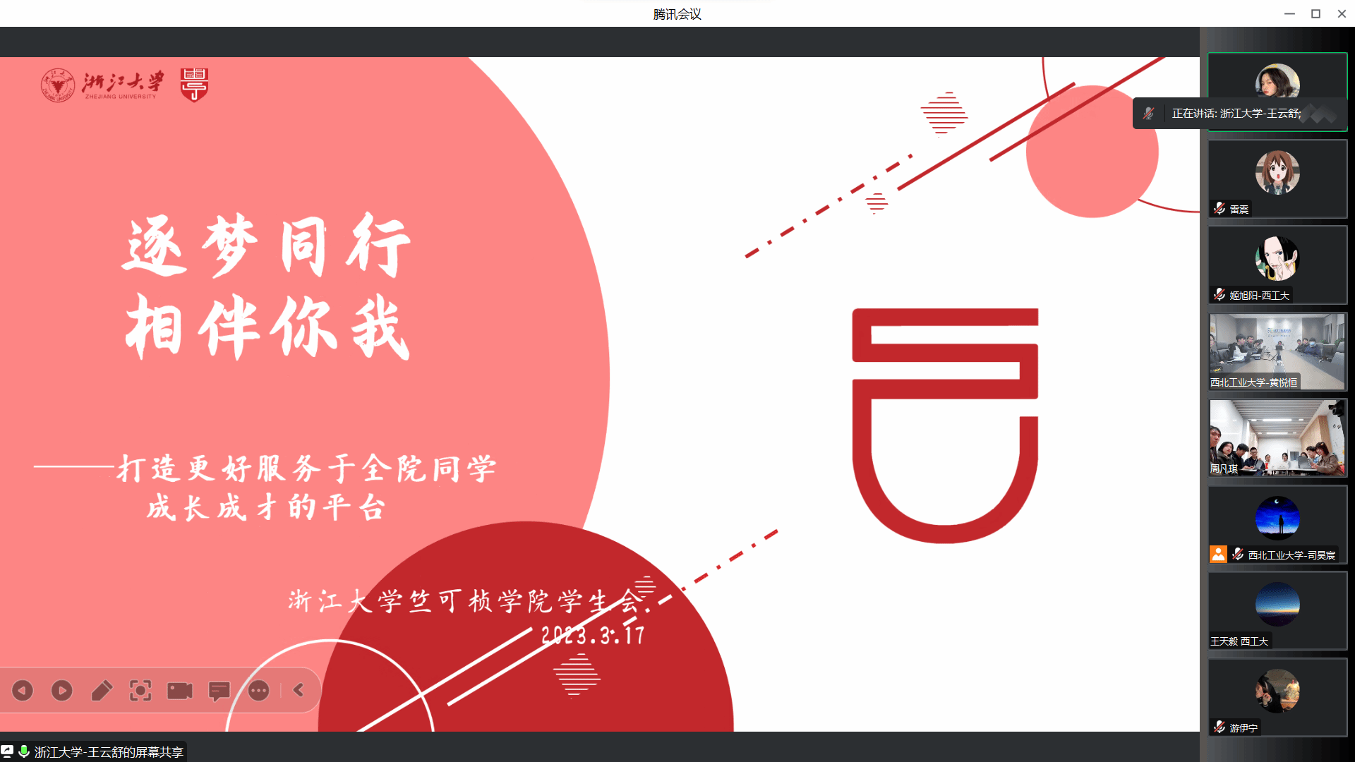 2023年3月17日晚,“求是勇毅,动力先行”浙大学子对话工大青年活动正式开展。活动采用线上视频会议形式,设置线下双会场与线上会场,围绕全国两会精神与学生会组织,双方通过互相交流学习、青年对话,碰撞思想火花。浙江大学竺可桢学院团委书记卢佳颖老师、新葡的京集团35222vip团委书记姜倩老师、两院学生会全体成员以及新葡的京集团35222vip先行学宣团全体成员参与会议。会议由新葡的京集团35222vip学生会司昊宸主持。