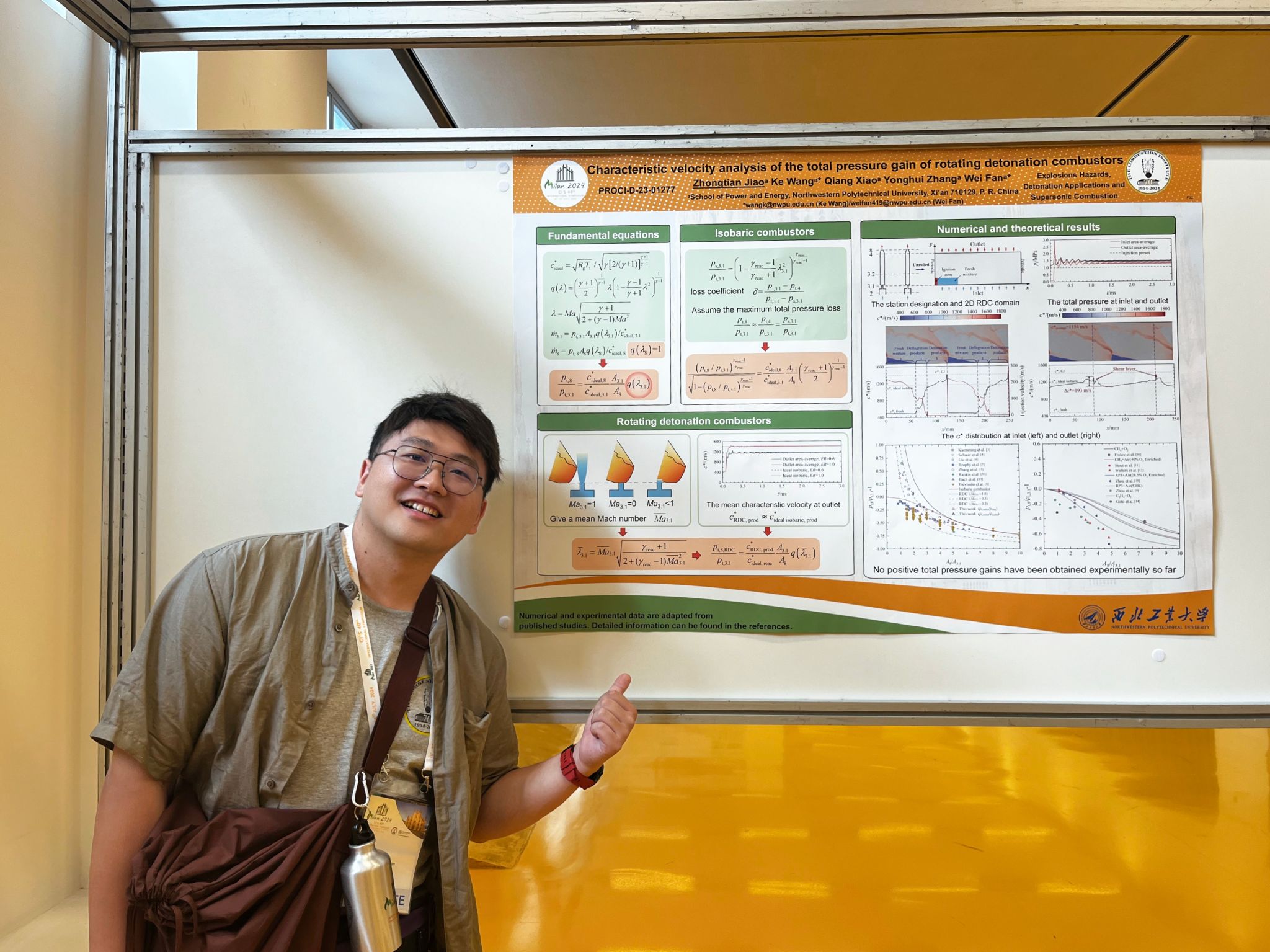 博士生焦中天做了题为“Characteristic velocity analysis of the total pressure gain of rotating detonation combustors”的海报展示。汇报以推进领域广受关注的旋转爆震燃烧室总压增益特性为背景,针对数值研究与实验结果中旋转爆震燃烧室增压能力的巨大差异,借助火箭发动机推力室设计常用的特征速度概念,剥离了在旋转爆震中紧密耦合的喷注和燃烧过程,构建了等压燃烧室与旋转爆震燃烧室总压增益(损失)与燃烧室出入口面积比的解析评估方法,为旋转爆震的燃烧室设计、总压增益能力的评估和优化提供了重要参考。 (论文原文:https://doi.org/10.1016/j.proci.2024.105626