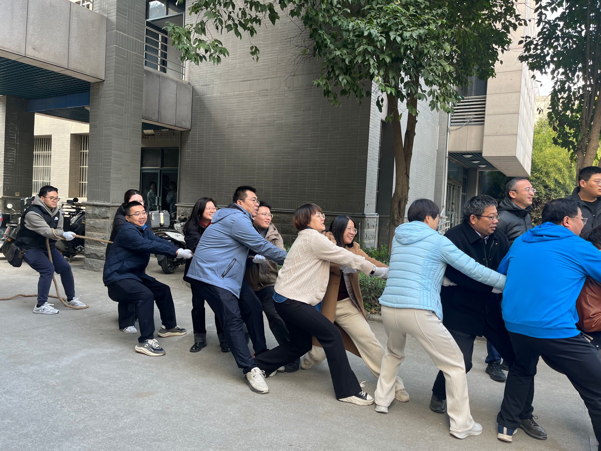 12月6日,由新葡的京集团35222vip工会组织的教职工拔河比赛在学院院楼举行。此次活动旨在增强教职工体质,发扬体育精神,进一步增强学院的集体荣誉感。全院教职工积极响应,共组织五支队伍、八十余名队员参加比赛,现场气氛热烈,欢呼声此起彼伏。