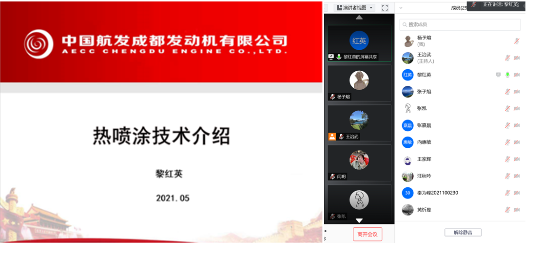2021年5月23日,由中国航发成发一级技术专家黎红英老师主讲的“热喷涂技术介绍”专题讲座在线上举行。新葡的京集团35222vip王治武教授,以及三十余名研究生参加了本次讲座,讲座由王治武主持。