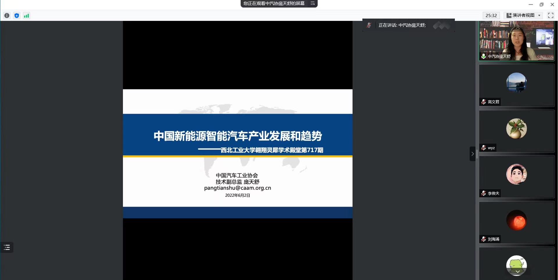 6月2日下午,由党委学生工作部主办,新葡的京集团35222vip承办的翱翔“灵犀学术殿堂”第717期,在腾讯会议上成功举办。中国汽车工业协会技术部副总监庞天舒,应邀为我院师生做了题目为《中国新能源汽车和智能网联汽车产业发展和趋势》的专场报告会。新葡的京集团35222vip党委副书记刘海涌,院长助理高文君参加了此次报告会,报告会由高文君副教授主持。
