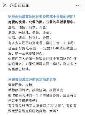在创作《长安校区这十年》时,学长本想将这个主题做成一个让更多人回忆,投稿的多期栏目。但由于策划的不充分造成了投稿不丰富,最后因为素材太少成为了一片抒情文,没有达到想要的效果。于是学长发现像这种策划,要在合适的阶段需要借助外部力量,形成一个完整的方案才行。正是通过这样一次次的总结,齐学长积累下了许多宝贵的经验,在创作路上不停地前进着……