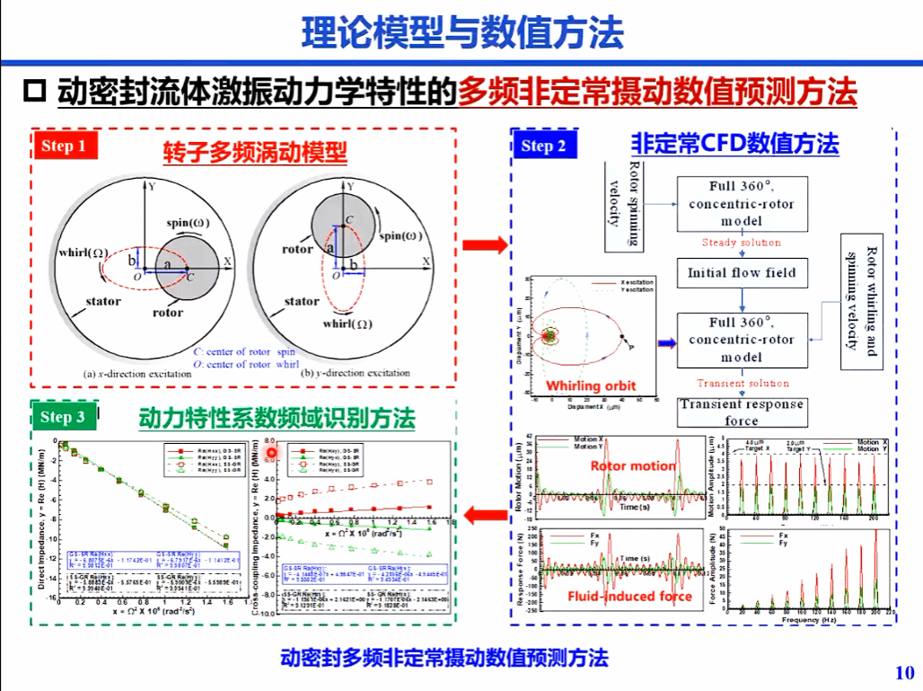 李志刚教授首先针对动密封动力学特性的理论建模进行深入研究,发现Bulk Flow模型预测精度低、Steady-state CFD模型不适用于动密封流体激振、Transient-state CFD模型不满足宽频域预测等缺陷。针对上述模型的不足,李志刚教授建立了动密封多频非定常摄动数值预测方法,具有预测精度高、普适性强、计算速度快的显著优势,并被众多高校、研究所采用并给出高度评价。
