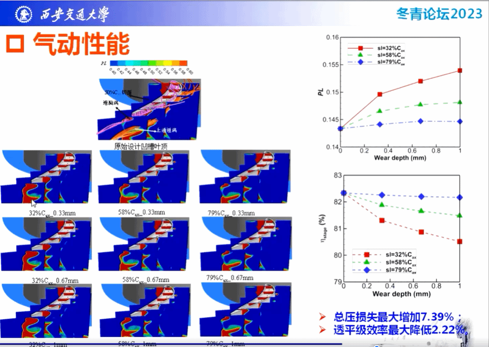 随后晏鑫教授介绍了磨损参数对透平级叶顶气热性能的影响规律,其研究结果表明:无论是在线性模型还是依据实际运行条件设计的模型,磨损均会对发动机的冷却传热性能和气动造成不同程度的影响。