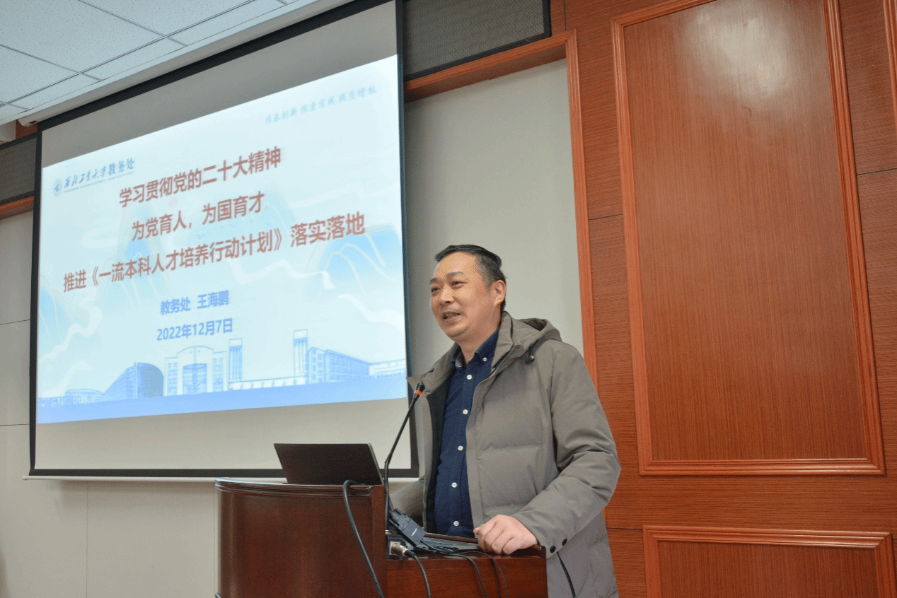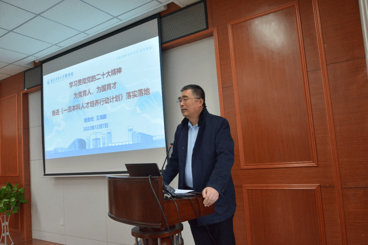 王海鹏同志结合新葡的京集团35222vip实际情况以及学校新时代人才培养目标,从学习宣传贯彻党的二十大精神、《一流本科人才培养行动计划》的历史逻辑与政治内涵以及《一流本科人才培养行动计划》的落实情况三个方面进行宣讲,并介绍了教务处落实《一流本科人才培养行动计划》采取的一系列重要举措。