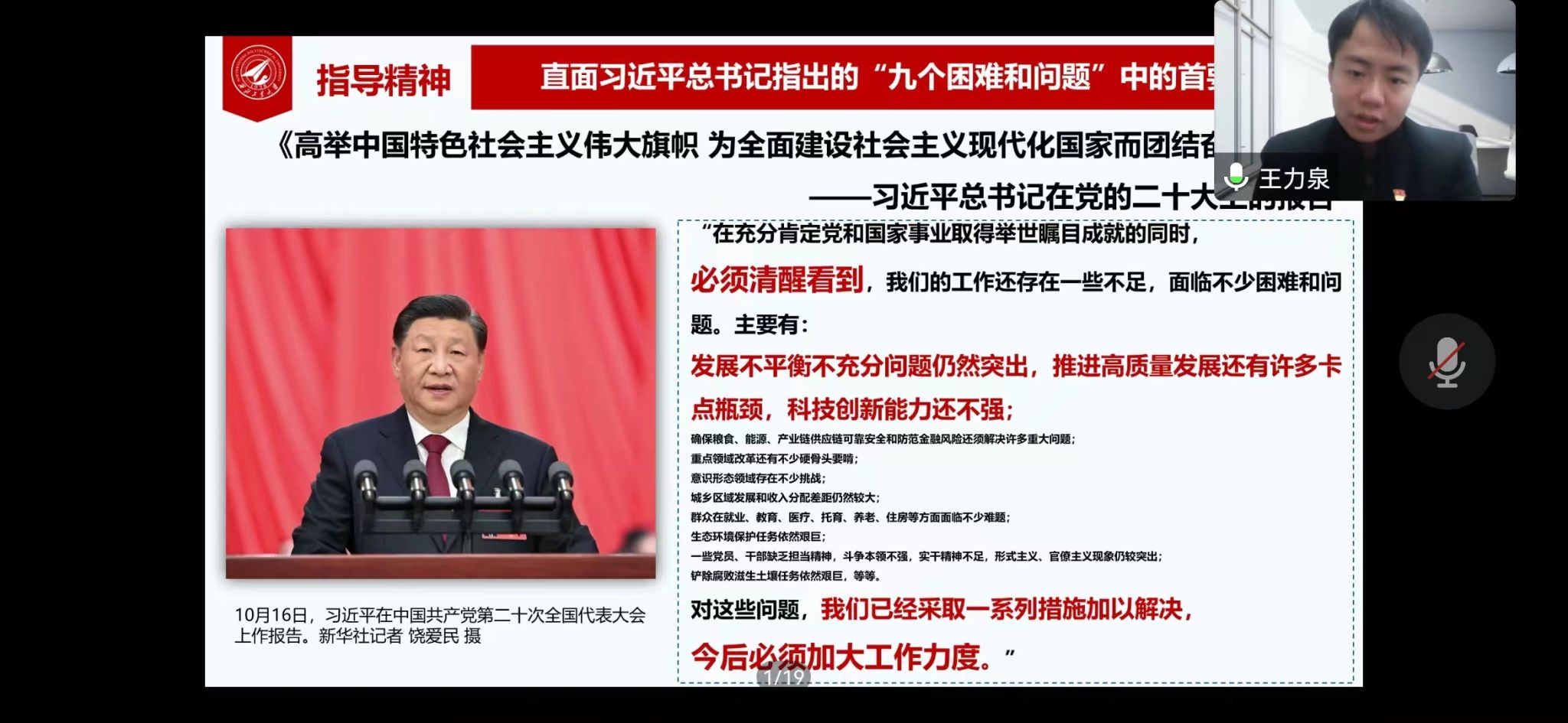 为了深入学习贯彻党的二十大精神,引导学院师生切实学懂弄通党的二十大精神。11月25日下午,新葡的京集团35222vip邀请工大青年宣讲团讲师王力泉宣讲党的二十大精神,会议采取线上方式,参加此次学习的有入党积极分子及发展对象共计220人。